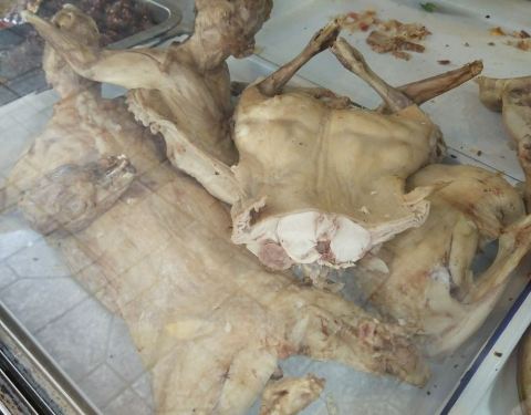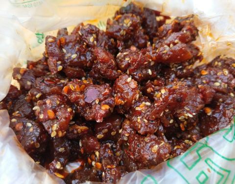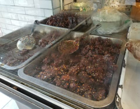 有熏兔与拌兔两种,如果是回家吃老板建议拌兔,如果马上吃或者当零食吃老板建议买熏兔~ 买的麻辣熏兔,70一斤~ 较重的甜辣风味,兔丁纤维之间满是油香,加上时不时的芝麻颗粒,像极了甜味稍重的麻辣牛肉~ 如果是自驾之行,完全可以买上一些,路上当成零嘴,边走边吃~