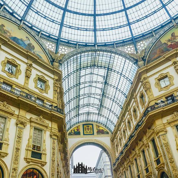 埃马努埃莱二世拱廊位于米兰标志性建筑米兰大教堂的广场北侧,并连接斯卡拉广场。位于米兰大教堂一侧的入口处还有一个巨大的门,吸引着来来往往的游客前往长廊内部一探究竟。 长廊结构 埃马努埃莱二世拱廊是一个带顶棚的拱廊街,得名于意大利统一后的一位国王埃马努埃莱二世,这里被认为是欧洲非常美的商业拱廊之一。拱廊是设计师仿照巴黎古典商业拱廊而建的,两条交叉的长廊呈十字型,南北长198米,东西长105米,两条玻璃拱顶的走廊交汇于中部的八角形空间,上方是一个玻璃圆顶。阳光透过玻璃屋顶,照射在底下精致的浮雕和壁画上,泛着神圣的金色光芒。虽然在建造之初,米兰的市民对此方案略有怨言,因为它破坏了部分古建筑,但在建成之后却获得良好的口碑。如今,拱廊迎接着来自世界各地的观光客。 从米兰大教堂一侧的门进入拱廊,映入眼帘的就是铺满大理石的长廊,上面印着彩色、象征着意大利的团结与自信的马赛克。拱廊的很多地方都有明显的代表着意大利各个城市的图案,比如都灵的公牛、罗马的母狼、佛罗伦萨的百合、米兰的白底红十字等等。拱廊里有一幅非常有名的公牛图,据说用脚跟踩着它的关键部位顺时针转三圈儿就会有幸运降临,目前那地方已经被磨成了一个坑。 购物 血拼爱好者来米兰值得一去的购物地也包括这条长廊。这里既有Gucci、LV、Parada这样中国人耳熟能详的店铺,周围还有很多如H&M、Zara等大众品牌店铺,拱廊下的Prada精品店,规模和橱窗布置都是米兰数一数二的,尤其橱窗布置天天更新,光是站在橱窗外欣赏也是一大乐事。