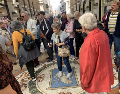 长廊里有一幅著名的公牛图,据说用脚跟踩着它转三圈就会有幸运降临埃马努埃来二世长廊呈十字形,也是米兰最繁华、热闹的地方。长廊里有一幅著名的公牛图,据说用脚跟踩着它转三圈就会有幸运降临。