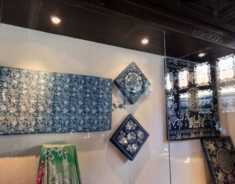 景点名:宏源源泰染坊 地址:桐乡乌镇东栅景区内 东栅的宏源泰染坊和西栅的草本木色染坊差不多相对应,这里的染布基本蓝色调。这里是前店后坊布局,前厅是商铺,出售蓝印花布制成品,后厅是作坊,包括展厅、上浆烤花间、染布间和晒场。