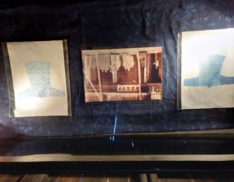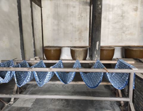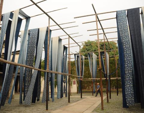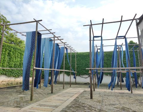 蓝印花布作坊,包括展厅、上浆烤花间、染布间和晒场。晒场的高杆上晾满了蓝印花布,是适合拍照的好地方。