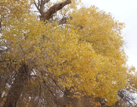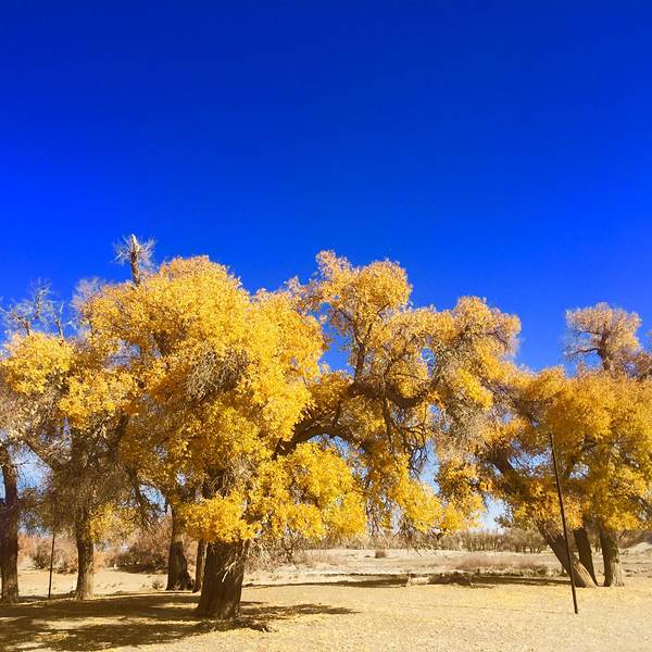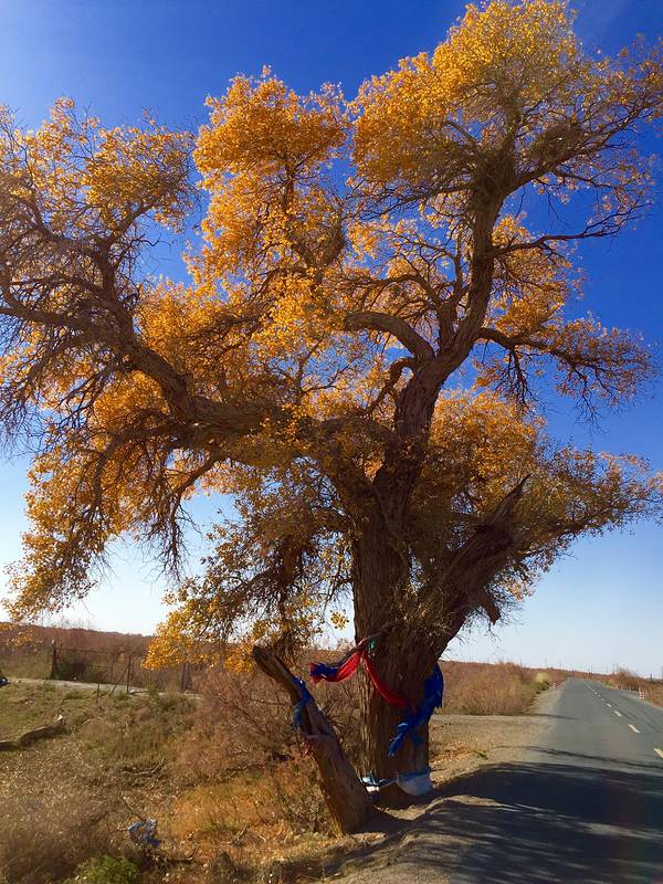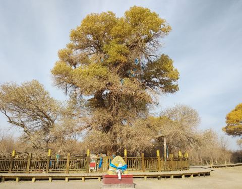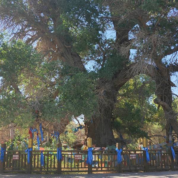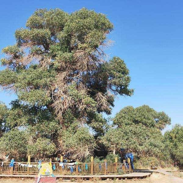 在额济纳旗的有一颗880年的胡杨树,也是额济纳旗最大的一颗树,需6个人手拉手才能围住这颗树,大家都称这颗是——额济纳神树。远远就能看见茂密的树叶,粗大的树干,每年当地人都会来祭祀,祈求风调雨顺,畜草兴旺。