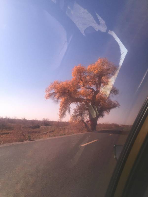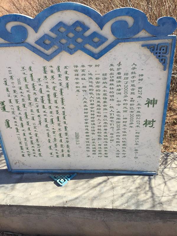 策克口岸结束后,师傅带我们去了神树,神树是胡杨树,有几千年的历史了,她的周边生长出了很多的小树,也都已经很大了,我们这个时候来看神树,叶子是完全落光了的,在网上看了下她有图片的样子,很大,很美,10...