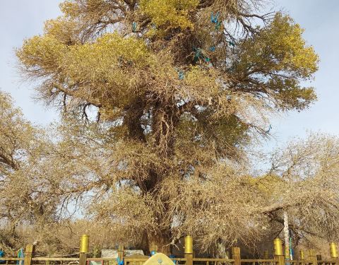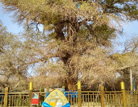神树,树龄达880年。神树高23米,主干直径2.07米,需6人手拉手才能围住。在这棵千年“神树”周围30米内,又分生长出5棵粗壮的胡杨树,牧人们把它们叫做“母子树”,非常壮观。神树长在一个老奶奶家的承包林里,她收取10元门票,值得一看。