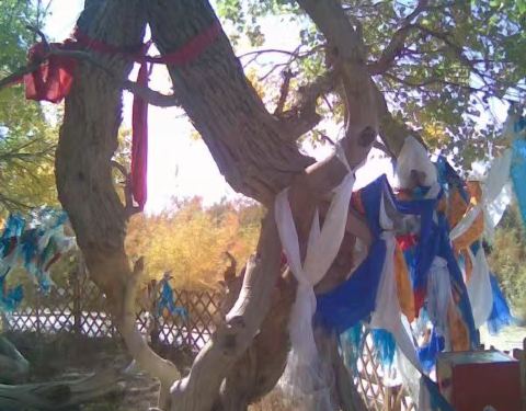 神树位于额济纳北面25公里处,树身高27米,直径约4米,树龄巳达880年,堪称额济纳胡杨树之王。按照当地习俗,神树被赋于神秘的色彩,成了当地老百姓祭祀苍天神灵的附载物。要参观神树,须给门口坐着的老太十元钱,方可入内。