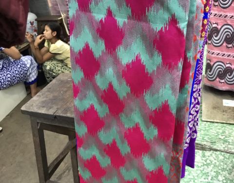 昂山市场,密密麻麻的各种服饰 玉石 礼品 ,还有当地的小吃, 值得逛一逛。 中英文都可以使用。 小朋友买了隆基, 好看。