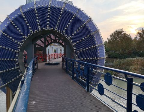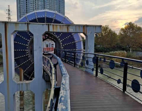 众所周知,横贯中国的南北地理分界线为秦岭淮河,淮安作为一个节点,应该是很希望能借此凸显自己吸引关注,于是新建了南北地理分界线标志园,2008年开工,次年建成,作为主体标志的“红蓝桥”横跨古淮河上。桥和中间的圆球被涂成半红半蓝,分别代表南方北方,大球内放置的标志,在中国地图上标出了秦岭淮河的走向及淮安的坐标。 值得一提的是,此桥并非新建,而是对1930年代建成,后遭废弃的一座钢筋混凝土桥梁进行了改造。起死回生的旧桥虽然没成为预期的“网红”,但方便了两岸居民通行,更成了当地一道别致的景色。