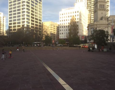 在Queen街上,离AUT很近,广场上有好多鸽子。旁边就是电影院!