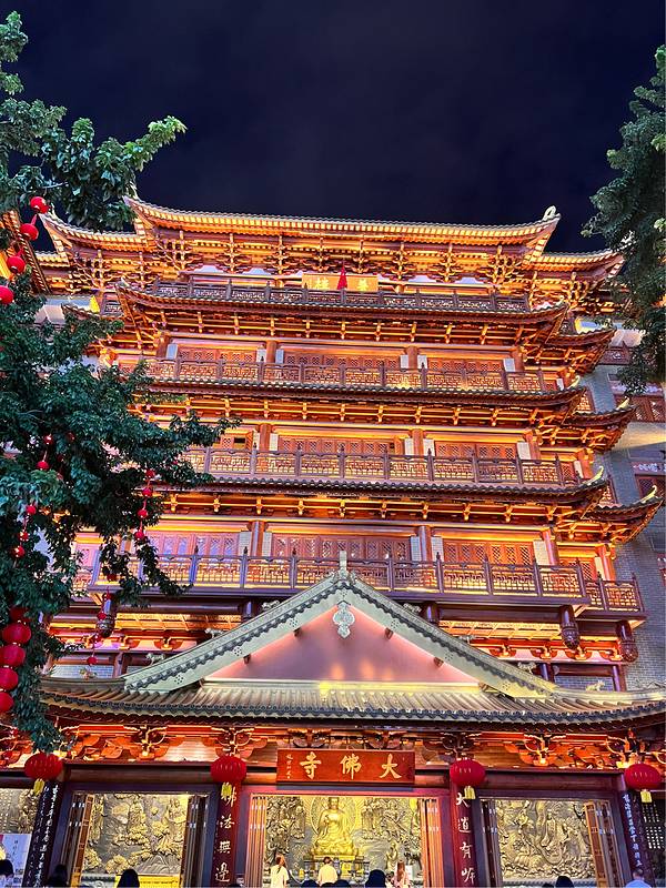 大佛古寺殿宇极具岭南地方风格,夜晚灯亮后尤为漂亮,藏在北京路的闹市旁,绝对是灯火阑珊处的静谧,走进一看就像误入了千与千寻的世界,随手一拍就很出片,后期加上孔明灯超有氛围感,所有路过的人都会驻足打卡拍照📸大佛寺里面也可以进去祈福