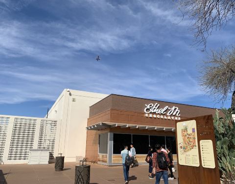 Ethel M巧克力工厂距离拉斯维加斯市中心约半小时车程。巧克力工厂看起来并不大,走进大门就是一个纪念品的商店,里面关于Ethel M巧克力商品一应俱全。工厂旁边还有一处仙人掌花园,可以欣赏到多达三百余种的仙人掌。 1. 参观巧克力制作工厂 穿过纪念品商店是工厂车间,沿走廊内有关于巧克力制作历史的文字和图片介绍,制作巧克力的车间是开放式的,可供游客参观,里面的生产过程也比较简单,大多是机器制作,在选择不同口味的时候需要员工亲手操作。操作人员一丝不苟地工作,演示巧克力制作的步骤,现场制作巧克力,游客可以拍照做纪念。 2. 品尝新品种巧克力 走过制作车间,可以看到很多的巧克力产品展示区和专卖区,在这里你可以品尝新品种的巧克力,也可以在这里购买心仪的巧克力。这里的巧克力和纪念品都要比其他地方卖得便宜一些,所以机不可失。