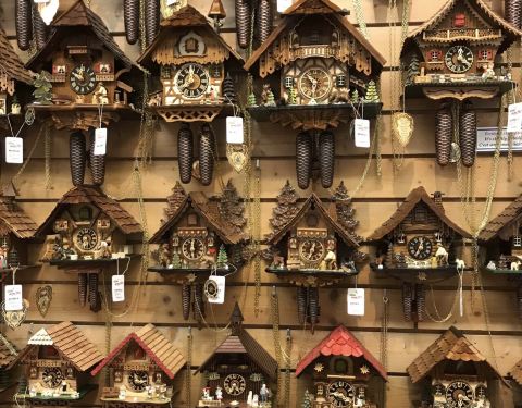 德国黑森林除了黑森林蛋糕外就是布谷鸟钟最出名了,在黑森林小镇特里贝格每家店几乎都有布谷鸟钟出售,还有一个一间房就是一个布谷鸟钟的景点。