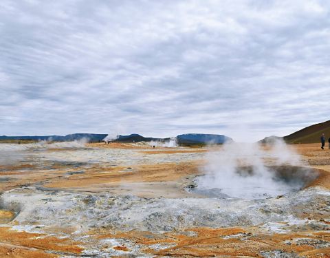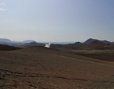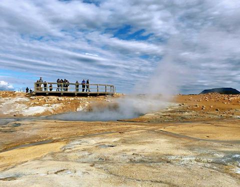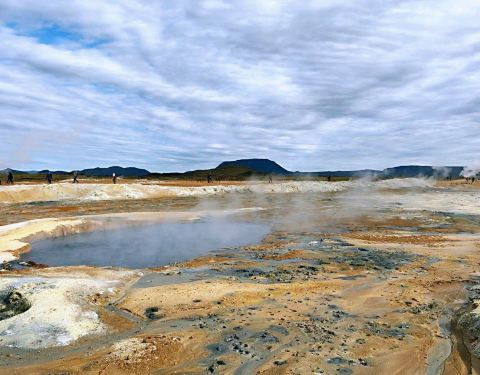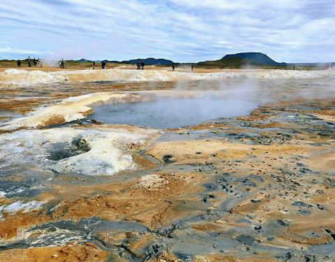 克拉夫拉火山是一座超级巨型火山形成的火山口,由于火山锥顶部失去地下熔岩的支撑崩塌形成的。参观的地区实际上就是破火山口的内部,让人感觉更像平地,沿途会经过一片硫磺地貌,空气中一股臭鸡蛋的味道。
