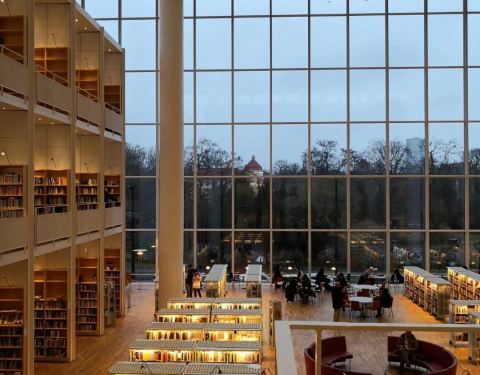 马尔默图书馆由古典与现代二个建筑组成,左侧的1905开放的红砖老建筑。右侧的现代建筑又叫“光之日历”,取自它具大的玻璃幕墙,无论是晴天或是下雨,坐在这里,都能让人有种心旷神怡的感觉。即使不看书,只是去感受下图书馆的氛围也是很不错的。而看书累了时,还可以看看窗外满眼的绿色,为眼睛做个SPA。