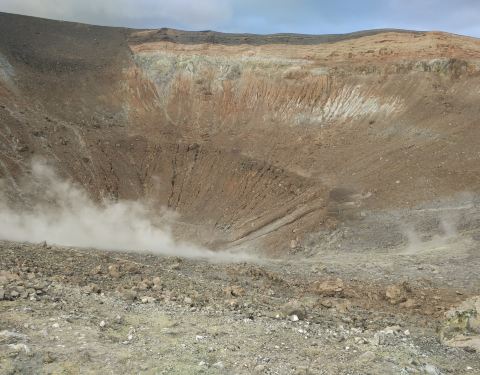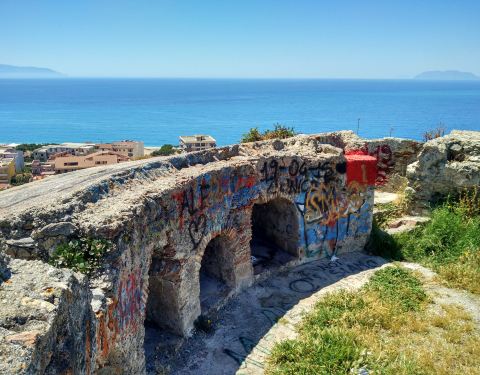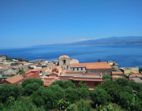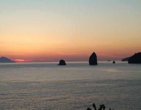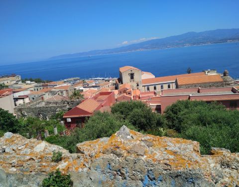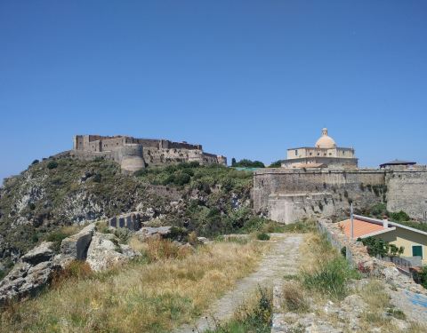 从米拉佐码头就可以看见山上的城堡,城堡是城市的至高点,即便闭馆我们也决定上去看看,果然不负众望到山顶看着蔚蓝色的大海和山底下的橘红色的屋顶,非常漂亮。城堡周围还有不少的仙人掌开着黄色的小花非常艳丽。遗憾没有能够进去参观,只能沿着城墙下走走。其实很多来米拉佐的人都是要到对面的小岛(Vulcano武尔卡诺岛)旅游,或者参加火山旅游团(由一些专业人员带领去看活火山,有白天的和夜晚的)。对面的武尔卡诺岛在暑假几乎客满很难找到住房,住在米拉佐再花1个多小时坐快船过去玩上一整天也是一个不错的选择,而且从Vulcano武尔卡诺岛看Lipari岛海边的著名的几块大石头也是最佳位置。只是要注意天气和时间,若遇上大风船随时停开。下图是米拉佐古城堡和Vulcano武尔卡诺岛的景色,强烈推荐到Vulcano武尔卡诺岛至少游一日。Vulcano武尔卡诺岛上的火山只是冒烟,而且从Vulcano码头上去也只需30分钟左右。
