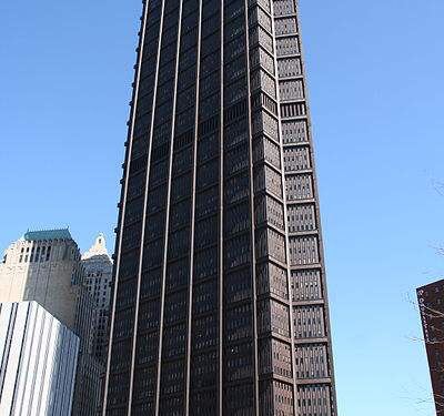 这所大厦由钢铁构成,一共64层,高达256米,是1970年建成的