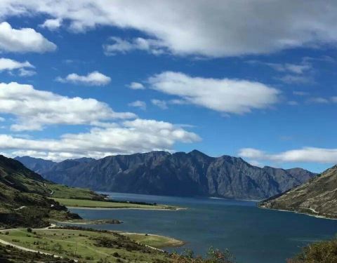 从皇后镇到瓦纳卡镇的路上风景都非常漂亮。清晰的大湖伴着阿尔卑斯山脉,加上蓝天白云,新西兰美景近在眼前
