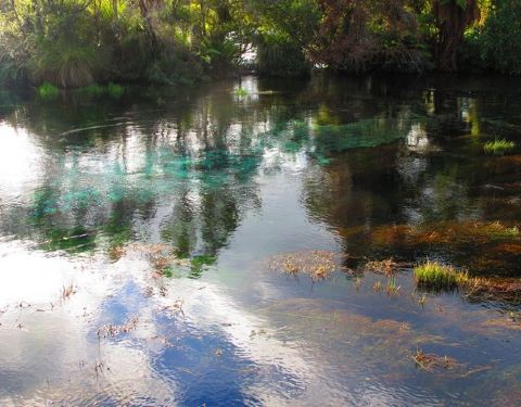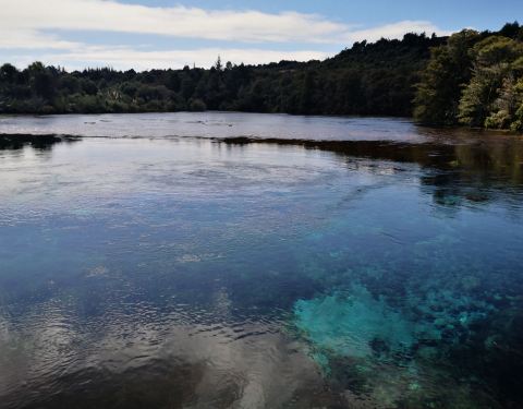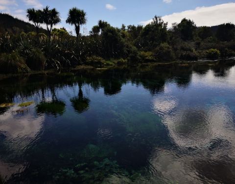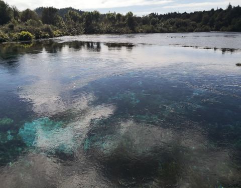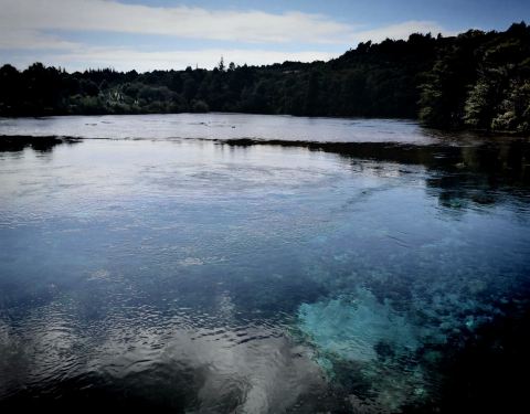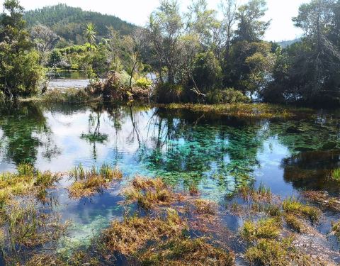 葡葡醛位置在新西兰南岛黄金湾附近,离阿贝尔塔斯曼国家公园很近,这里据说是一个个圣地出产南岛最大水量的温泉,主要确实很大,从地下竟然就相当于冒出一条河,而且这条河还挺宽 河水清澈见底,加上阳光的照射,配合上水底的浮藻,透出绿色和蓝色,以及各种其他的颜色,像一个浮踪的调色盘一样