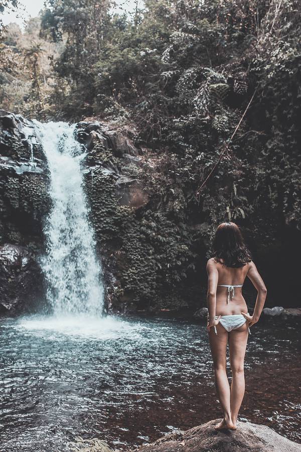 乌布是我最喜欢的一个热带雨林的城市。不大,但包括了瀑布、玉林、火山、梯田等奇妙景观。去乌布,一定不能错过的就是瀑布。巴厘岛是一个火山岛,高山地貌,所以瀑布众多。因为行程有限,我们选择的是Gi git瀑布,还有Tukad Cepung Waterfall岩洞瀑布。🌟🌟🌟🌟🌟Tukad Cepung Waterfall 【简介】Tukad Cepung Waterfall是巴厘岛最特别的瀑布,位于岩缝中。如果天气好加上运气好,太阳光线会在岩缝中形成射线状。 【位置】位于乌布东北方向,大约30km,车程估计1小时左右;从停车场到瀑布大约需要步行15分钟,进入瀑布需要淌水(大约齐膝) 【门票】Rp.15,000 Tibumana Waterfall 【位置】距离乌布最近的瀑布,位于乌布以东大约15km处,车程估计半小时左右;从停车场到瀑布大约需要步行10分钟 【门票】Rp.10,000 🌟🌟🌟🌟Gitgit Waterfall 【位置】位于百度库区域,罗威纳以南,双子湖以北 【门票】Rp.20,000 Leke Leke Waterfall 【简介】打算前往水神庙和百度库区域的同学可以来Leke Leke,非常顺路。Leke Leke Waterfall的入口建的很精致。 【位置】位于百度库区域,水神庙以南,距离水神庙15km(30分钟),距离乌布30km(50分钟) 【门票】Rp.30,000 Sekumpul Waterfall 【简介】Sekumpul Waterfall是巴厘岛规模相对较大的一个瀑布,可以在一个地势较高的观景台观赏,也可以走到瀑布下面观赏。 【位置】位于巴厘岛北部,从水神庙开车还需要继续向北行驶大约21km,车程预估计40分钟 【门票】Rp.20,000 Tegenungan Waterfall 【简介】Tegenungan Waterfall应该是巴厘岛游客相对较多的一个瀑布,因为比较好抵达,开发的也比较完善,路比较好走,停车场附近甚至还有纪念品市场。 【位置】位于乌布以南大约10km处(车程半小时) 【门票】Rp.15,000 Kanto Lampo Waterfall 【位置】位于乌布以东 【门票】Rp.15,000牵手照,适合情侣。构图把人物放在右下角,与瀑布形成对称。在瀑布的左边有个大礁石,可以爬山去采用俯拍的角度,更加有气势。大景构图,采用固定机位慢门拍摄我们从库塔包车去乌布,这也是我最喜欢的城市🏠。也是带给我最多旅行惊喜的地方。从库塔包车到乌布大概一个多小时,千万别睡着。路上会遇到很多自然风光,高山雨林,热带植物,梯田等等。司机一般会建议你去一个猫咖体验馆去,这个你是可以拒绝的。人家是为了赚取小费。如果不是资深咖啡爱好者,这个可以不去。 Gitgit(吉尔吉特瀑布)是乌布一个有名的景点。这边的瀑布不大,但好处是游客超级少。我之前是在Instagram上看到国外的其他摄影博主拍的片子,专程去的。喜欢拍照的妹子一定不要错过,不用排队,不用担心有其他人入镜,简直不要太爽。 ⚠️TIPS: 1.寻找机位,如果不懂得怎么构图,可以参照我的构图方式。 2.这套是镂空的白色泳衣,比较凸显女生的好身材。 3.如果想拍出像丝绸一样的瀑布,可以采用慢门拍摄,现在手机都自带有。最好带个脚架。这组背影照,也是仿照牵手看世界的那组拍的。这条裙子是在乌布的夜市买的。很适合拍背景。我们在吉尔吉特瀑布拍了两三个小时,基本上没有人打扰。这两组片子我都很喜欢。第一次见这种长在树上的菠萝蜜,乍一看像是榴莲。