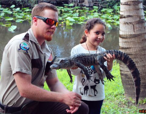 不知道听谁说,没有看过沼泽地就等于没来过迈阿密。于是这次决定一定要看看沼泽地。这个大沼泽地游猎公园 Everglades Safari Park挺不错的,虽然离迈阿密市区有点距离需要开车。附近也有好几家类似的公园,可能是不同的公司在经营吧。在排队等候上“草上飞”船的时候就在边上看到了鳄鱼/短吻鳄(后面统称鳄鱼)。Crocodile和Aligator经常都被翻译作鳄鱼,但还是有区别的。我们先是坐了草上飞,一路上沼泽地美景不断,船长各种漂移,其实还蛮刺激心跳的。沿途看到了几只野生的鳄鱼。坐了大概45min草上飞就回到了码头。在小型的博物馆那里转了一下,里面有一只很小很小的gator好可爱啊。然后就是去看鳄鱼表演了。其实没有什么很惊险的表演,就是很简短的有工作人员近距离喂食,不过工作人员站在有好几只张开血盆大口的鳄鱼旁边,还真是为他的安全感到担忧呢。表演完之后可以跟小gator宝宝合照,要求是捐赠(donation)3美元,不过其实就是收费了。胆大的可以去试试。如果想看沼泽地想坐草上飞,非常推荐来这里。
