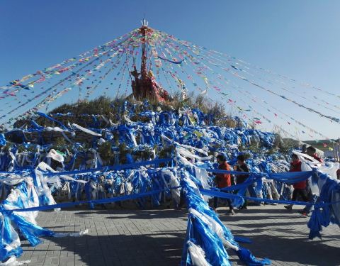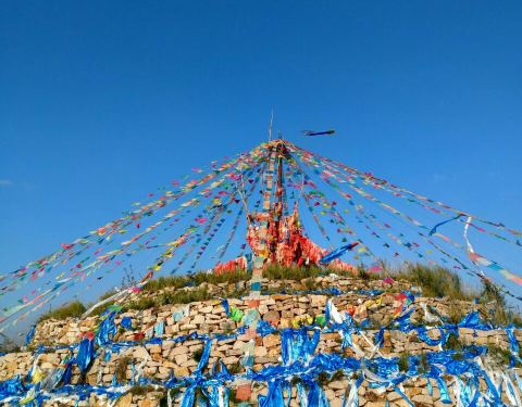 内蒙古民歌曲《敖包相会》,让蒙古民族特有的文化迅速传遍大江南北,达到家喻户晓、妇孺皆知的程度。来到敖包,通常会转三圈。按照当地人的说法,第一圈代表官运,第二圈代表财运,第三圈代表桃花运。敖包是蒙古语,意即“堆子”,就是由人工堆成的“石头堆”、“土堆”或“木块堆”。旧时,敖包遍布蒙古各地,原来是在辽阔的草原上,人们用石头堆成的道路和境界的标志,后来逐步演变成祭山神、路神和祈祷丰收、家人幸福平安的象征。