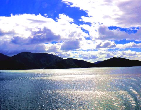 库克海峡链接新西兰南北岛,惠灵顿与皮克顿。乘坐海轮,使你在旅行中多一次海轮航行的体验。无边无际的大海,海天茫茫的天际线,使人顿觉心比天高,胸怀比海阔。天蓝蓝,水蓝蓝,白云连接天与海,此情此景可以把你的五脏六腑冲洗得干净无比。站在观景台上,看云卷云舒,潮起潮落,无比壮观。