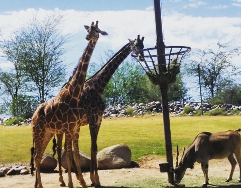 由于气候的关系,凤凰城动物园基本上是以热带沙漠的动物为主,一走进园区就看到一片辽阔的裁员,几只长劲鹿和类似羊驼的动物杂居期间,看来悠然自得