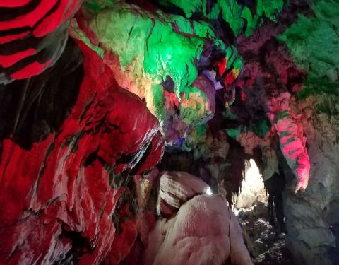 汤那洞正是出村必经之路,洞外风景如画,洞内在各色灯光的映衬下,更是美伦美幻