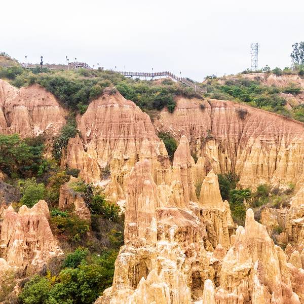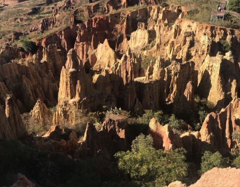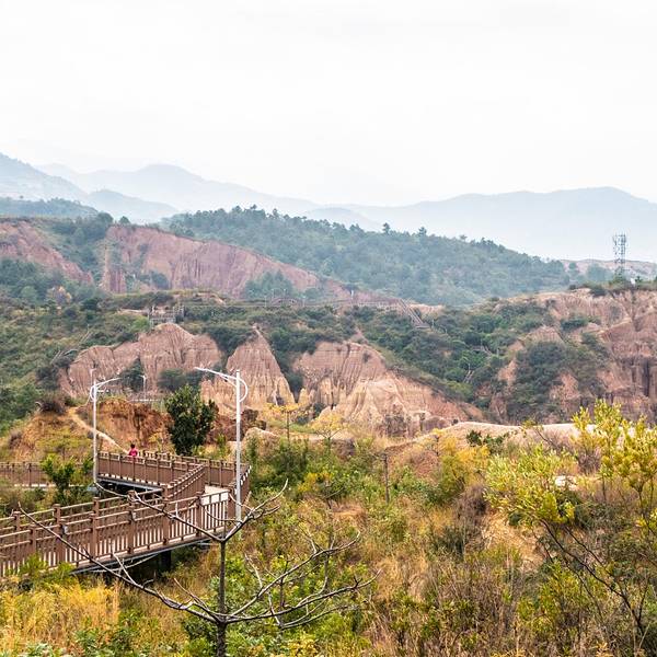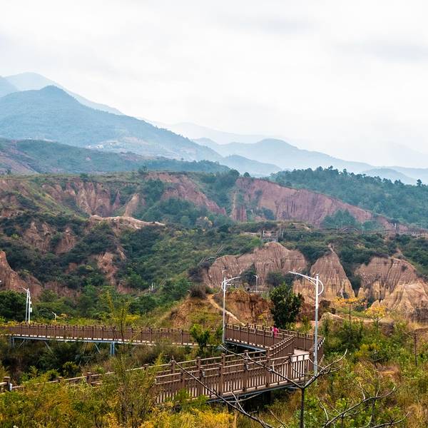 登高远望,绵延纵横的土林景观更是蔚为壮观,令人震撼土林虽是一种水土流失现象的侵蚀地貌,但也是在历经沧桑岁月中大地雕琢出的自然奇观,南涧土林正是上天赐予的一道奇景。在冬日夕阳的照耀下,层层叠叠的南涧土林在光影中呈现出黄、橙、红、褐等不同的色彩,并随...土林虽是一种水土流失现象的侵蚀地貌,但也是在历经沧桑岁月中大地雕琢出的自然奇观,南涧土林正是上天赐予的一道奇景。在冬日夕阳的照耀下,层层叠叠的南涧土林在光影中呈现出黄、橙、红、褐等不同的色彩,并随着日落而神奇变换,犹如一幅天作的油画;行走在观景步道穿行在土林间,耸立的土林似树、似塔、似笋、似幔,又如“八仙过海”、“仙女下凡”、“战马腾空”、“双狮望月”、“雄鹰展翅”,或独立成景、或成群俱现的奇特峰林造型让人浮想联翩,更感叹于大自然的鬼斧神工。登高远望,绵延纵横的土林景观更是蔚为壮观,令人震撼。 展开