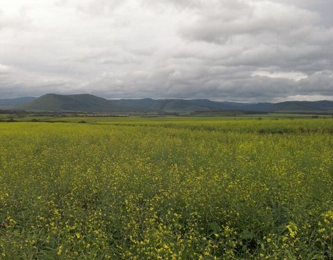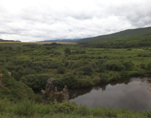 那里景色也是非常美,有两块岩石凸出于类似悬崖峭壁边,远看像2只老鹰一样。周围有麦田有油菜花地有草地有树林有灌木,峭壁下是蜿蜒曲折的河流。