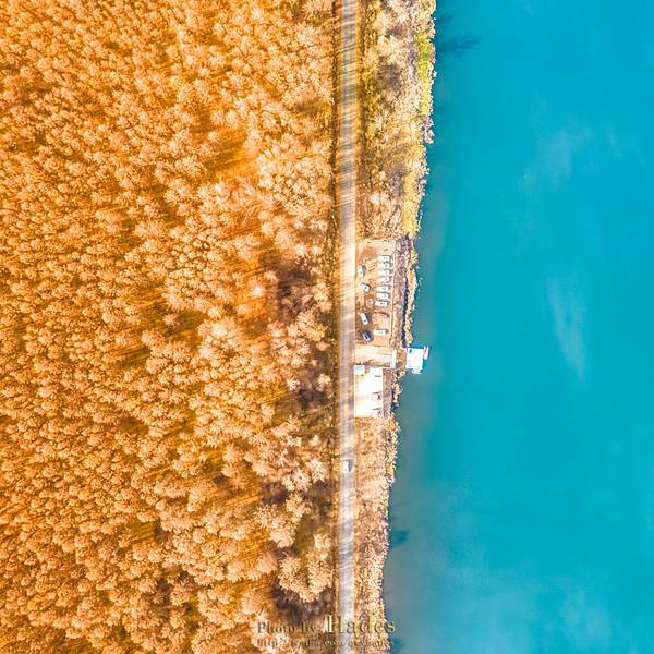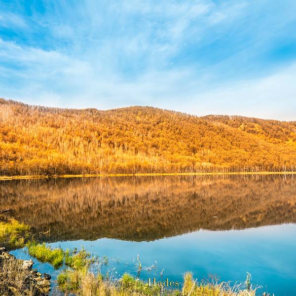 在秋季,宽阔的湖面周围一片金黄,湖水像镜子一样倒映着蓝天山林,实在是美极了