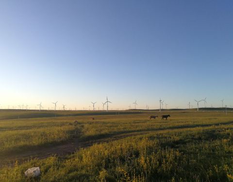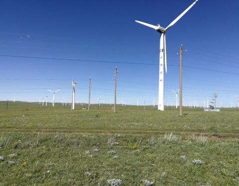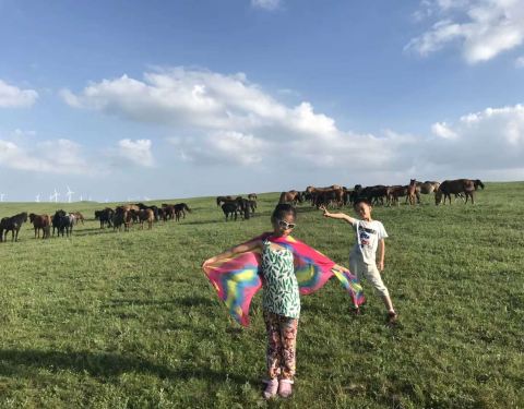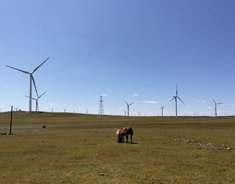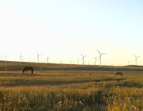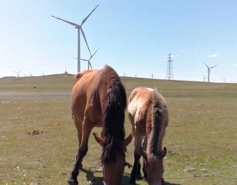 这里很多风力发电用的风车,分散在草原上,高高的,比较好看。风车下面有一些马这里很多风力发电用的风车,分散在草原上,高高的,比较好看。 草原上风确实很大,风车的扇叶遇到就会慢慢地旋转起来。风车下面有一些马。