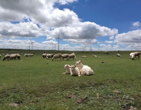 据说风机转一圈就是一度电,蓝天,白云,大草原,风力发电机,牛群,羊群满山坡,这地方真的很惬意