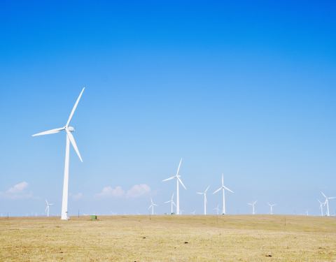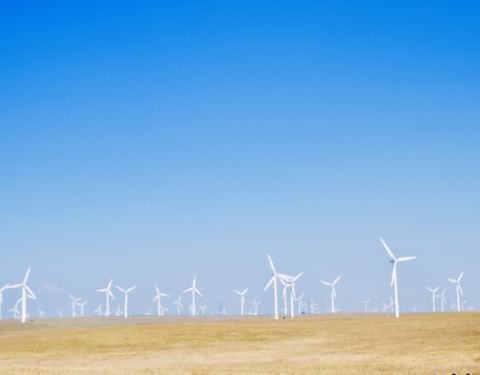 •环境:蓝天白云下的白色风车在草原上很美很壮观