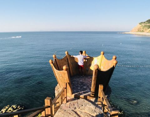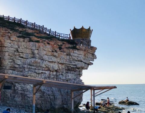 伊人礁位于北长岛九丈崖风景区内,从下面的海边往上看,礁石的侧面好似一张人脸的剪影,景区在头顶上修建了一个皇冠,在皇冠上看海,视野很赞呀!