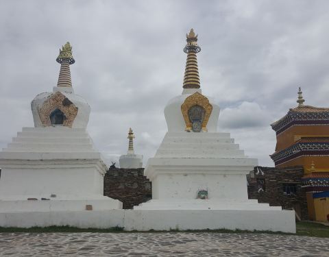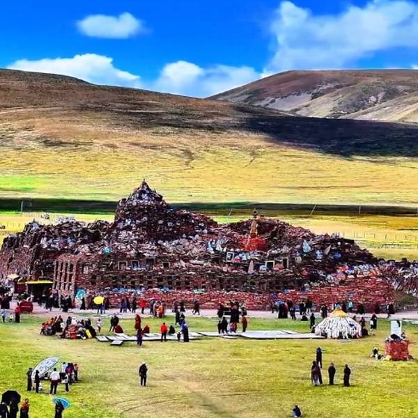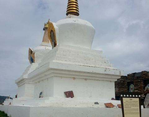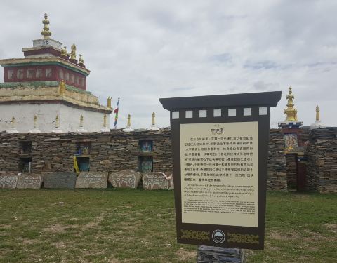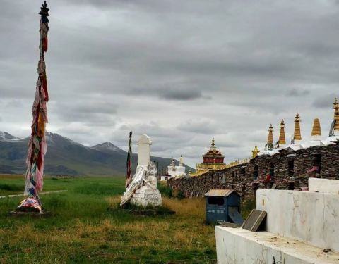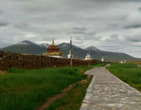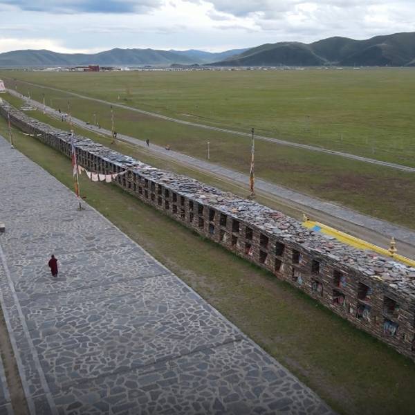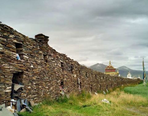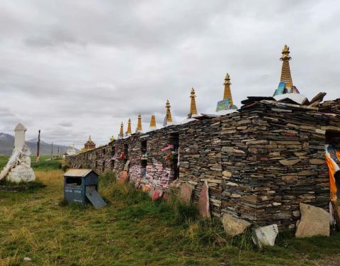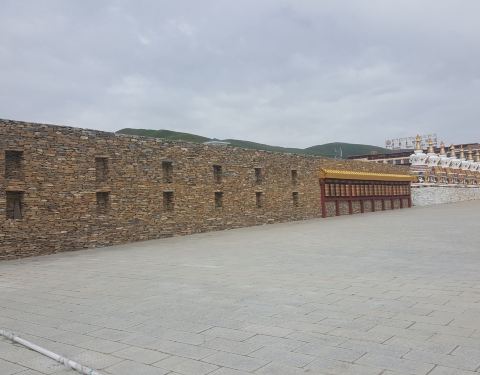 在广阔的草原上,突兀地建立起庙宇、经堂和灵塔,以及长长的用嘛呢石垒砌成的石经墙,令人震撼