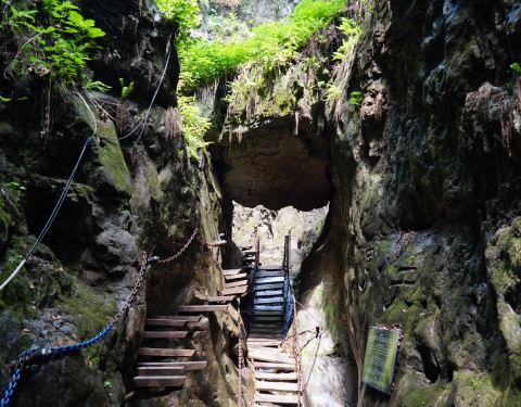 休介绵山的栖贤谷是一个充满惊险与刺激的山谷,因谷底一路是溪水,走路靠万壁上的铁制脚板或软梯,深受年青人喜欢,小孩与老人并不宜。