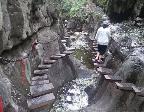 休介绵山的栖贤谷是一个充满惊险与刺激的山谷,因谷底一路是溪水,走路靠万壁上的铁制脚板或软梯,深...