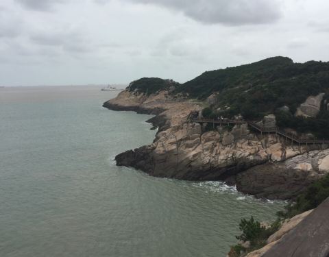 是在海边的一课大圆石头,上面写着东海神珠四个大字,小孩子很喜欢,不知道是不是天然形成的还是人工合成的。上面还有黄药师山庄,可以去看看哦。