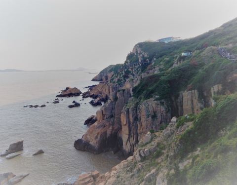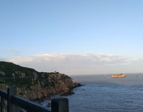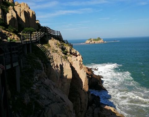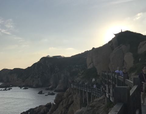 和尚套景区属于嵊泗列岛风景名胜区之一,位于泗礁本岛最东端,当地民宿老板推荐说是观赏海上日出的最佳处,由于我们去的时候查了天气多云,就放弃了凌晨登山赏日出。 9月份的嵊泗岛海水呈微微淡蓝,洗去了我对东海的“泥浆色”印象。 和尚套景区傍山建栈道,脚下就是悬崖峭壁、奇礁怪石、海浪拍岸,走的时候千万不要一直往下看,有恐高的人可能会出站眩晕(我就是这样。。。)走得过程中,你会发现下面有海钓的人,不得不佩服钓鱼人士的勇气!