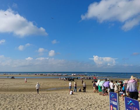 体验了三千海的赶海项目,自费,国庆3号上午到景区时游客较多,沙滩车、快艇、围渔拉网,赶海挖螺,特别快艇游的排队等候时间较长,这片水域海岸辽阔,砂细,清澈,水质比银滩好很多。