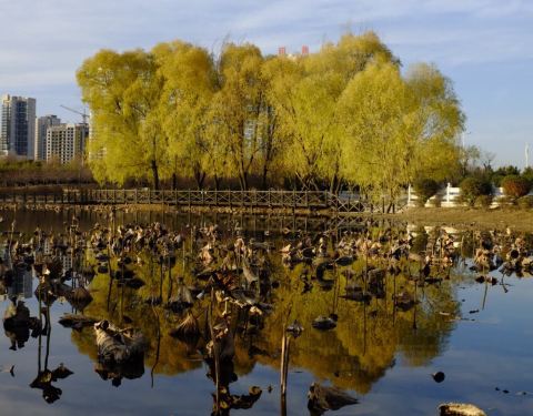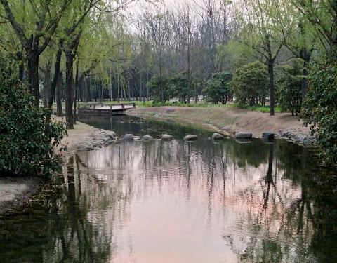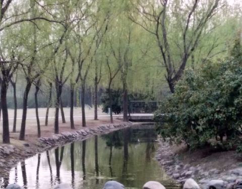 在河边行走,树木掩映,水中野鸭潜起,别有一番感觉