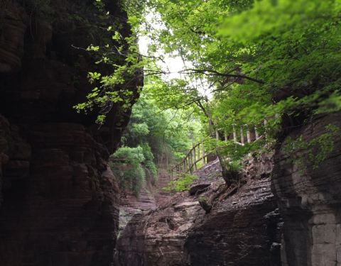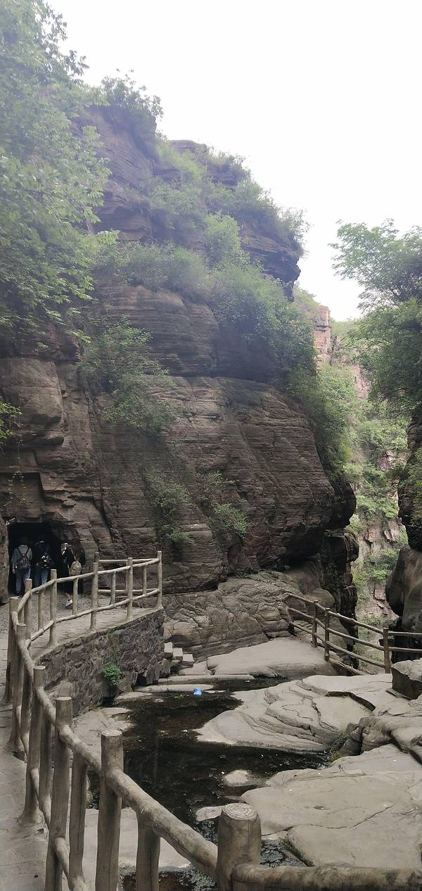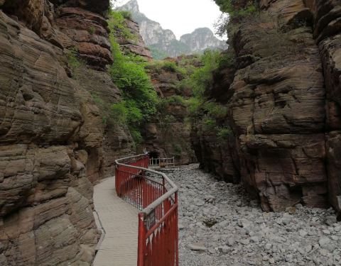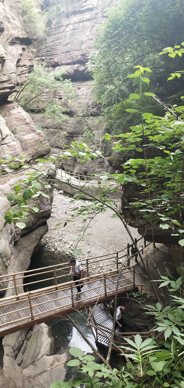 沟内如世外桃源,凉风阵阵,分外清凉,相传是太上老君修炼、分丹之仙境,村子由此而得名丹分沟位于辉县市万仙山景区内,是南太行精华景色的荟萃之地。丹分沟顶有一村庄名“丹分村”,丹分沟是白龙潭瀑布的源头,由溪水下切红石岩形成,沟内曲折婉转,红石壁立,深达百米,宽仅数米,龙口瀑、小龙女瀑...丹分沟位于辉县市万仙山景区内,是南太行精华景色的荟萃之地。丹分沟顶有一村庄名“丹分村”,丹分沟是白龙潭瀑布的源头,由溪水下切红石岩形成,沟内曲折婉转,红石壁立,深达百米,宽仅数米,龙口瀑、小龙女瀑、通幽潭等一级级潭瀑相连,飞珠溅玉、碧水幽幽,红石绿树倒映水中,如同立体的风景画廊。沟内如世外桃源,凉风阵阵,分外清凉,相传是太上老君修炼、分丹之仙境,村子由此而得名。7点52分打卡到这里,前面有2条类似这样的吊桥,小伙伴们在上面一边唱歌一边疯狂的晃动,此时疲惫与饥饿早已抛到脑外,一个个兴奋的像没长大的孩子。8点06分进入峡谷,水还不是很多,依绝壁而筑的栈道行走。整个峡峪山体奇形怪状,峡谷沟道千回百转。