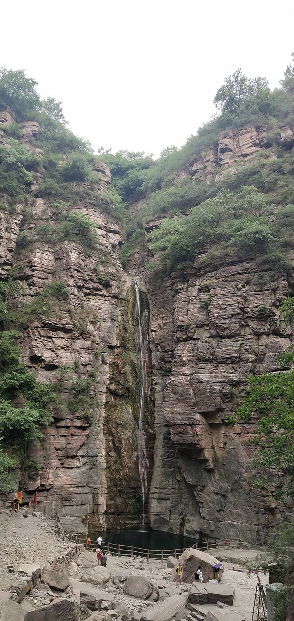 人们在绝壁上打眼架设铁梯,修建了木栈道,形成旅游线路。丹分沟是一个高山峡谷,两边是高耸的红岩绝壁,一端是万丈悬崖,另一端是高耸的石壁。峡峪不太长,大约只有一、二公里的样子,但阴森险峻,深而狭窄,落差很大,两边山体直上直下,具有太行峡谷典型的特征。丹分沟是道天然的红岩绝壁峡谷,两端封闭,与世隔绝,从来无人见过它的真面目。2004年,有识之士发现了这块处女地,便整合开发,使得原始美、自然美、野性美的丹分沟风光原汁原味的呈现在世人面前。8点22分来到黑龙潭,一个藏在深处的绝壁大峡谷,堪比红石峡!黑龙潭瀑布最为壮观,瀑布落差60多米,水量随季节变化,历经岁月,瀑布在石板上冲出了一个深潭,水面40平方米。只可惜,此次来的不是时候,水量太小了。山与水之间,因你又多了一道美丽的风景线。