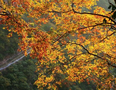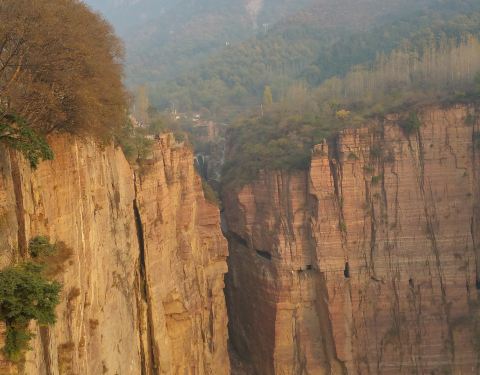 大峡谷两旁绝壁深130多米,如刀劈斧剁,岩石色泽赤红,被称为“红色绝壁大峡谷”。峡谷的北侧是绝壁长廊郭亮洞,从洞口向南观望,可看到雄峻壮观的绝壁,可看到崖上人家的瓦舍炊烟及崖边粗壮的黄榆树。从峡谷南侧可看到绝壁长廊的35个天窗及郭亮洞横穿绝壁的雄姿,蔚为壮观!