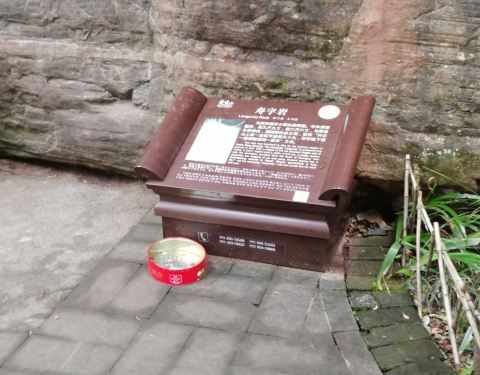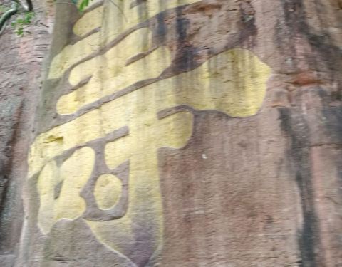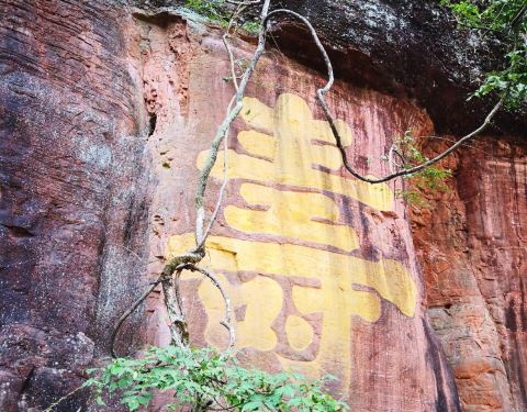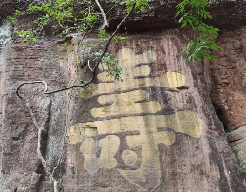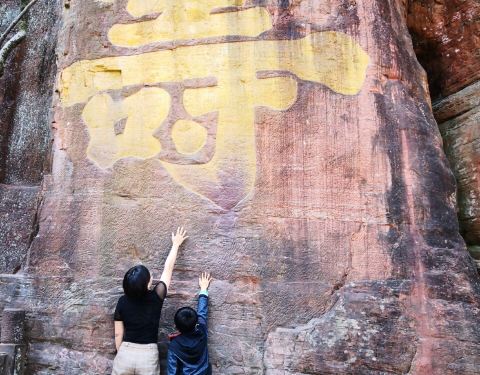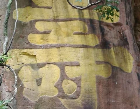 很大的一个寿字,金色的,出自名家朱熹之手。寿字岩下走一走,可以活到九十九;寿字岩上摸一摸,可以活到一百多。现在寿字的下面已经快没有颜色了。