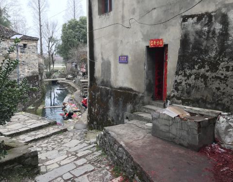 途中特意绕到这里,看介绍上说宣城的水东老街形成于明万历年间。老街内保存着大量明、清古建筑,青砖灰瓦。老街入口处的宁东寺(又名三官殿),始建于唐代,是宣州现存最古老的寺庙。这个寺庙还是很值得去的,很古老的气息,寺庙宁静、安逸,让人的心情平静下来,默默的点了三支香虔诚的叩拜佛主,还有热心的居士在一边敲钵盂。走在水东老街长长的街巷,看着两边成排的木板门有些许我小时候的回忆,但这里已感受不到往昔的繁华,在老街上有著名的“十八踏御井”,沿阶而下,左边有一方形的古井,不过现在已看不出古井的样子,只感觉是个水池,十八踏下一道井是青石砌成的方形古井,井下有一个20余米长的水池,一座石拱小桥划分用水类别:桥上饮用,桥下盥洗。井水清澈甘冽,终年不涸。但我感觉因为当地人不怎么保护,所以现在的水质也已很不好,但仍有人在里盥洗衣物、及蔬菜和碗具。我们是过年期间来到这里的,街道上冷冷清清的,老街里也很少的人,感觉当地居民大多已不在这里生活了,所以整个老街给人的感觉很萧条。