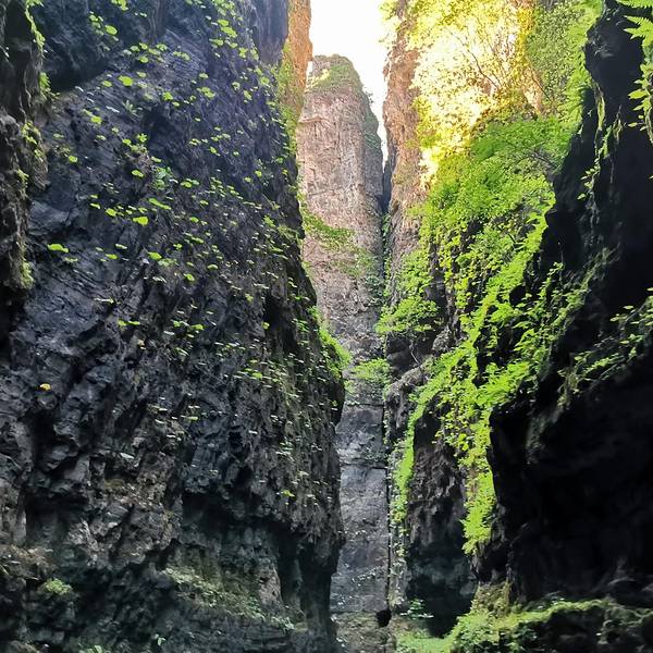 金线悬针位于海棠峪峡谷内,是一处山峰峭壁之间的“一线天”景观——山体之间一条垂直的裂隙像一条线...