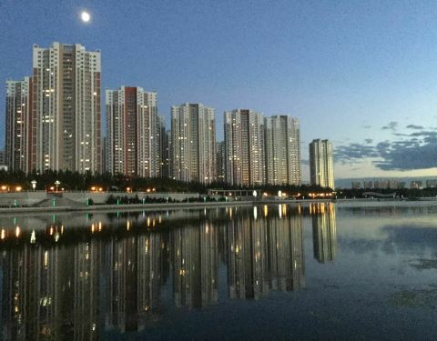 现在的景色很美,湖面很大,微风轻抚,湖的四周非常干净,白天也有一些人在绕着湖步行,有跳舞的,有在健身器材锻炼的,晚上围着湖步行的人更多,给市民们锻炼休闲营造了美好环境!