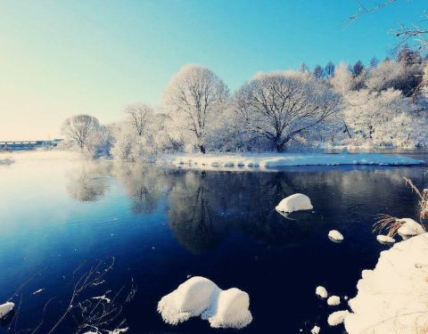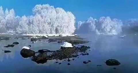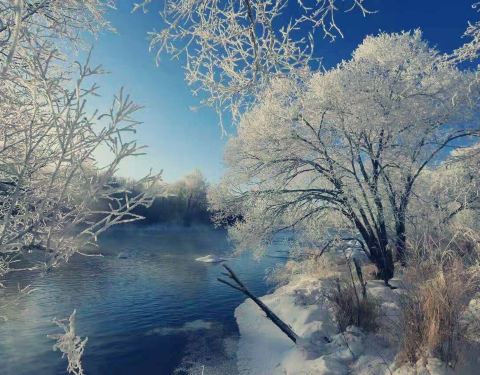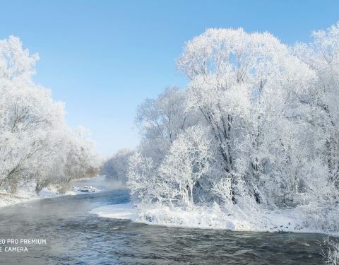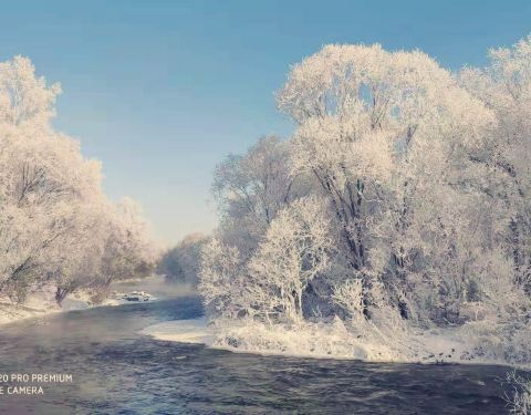 ...嚣,宁静心灵的好地方,河边的雾松宛如人间仙境,摇晃树干,挂雪纷纷落下,人置身其中 照的照片很美