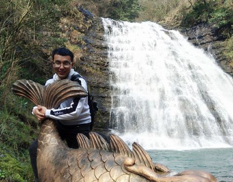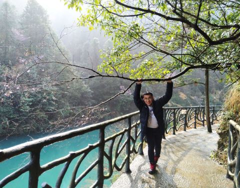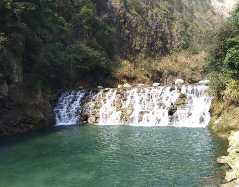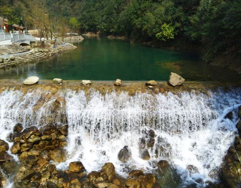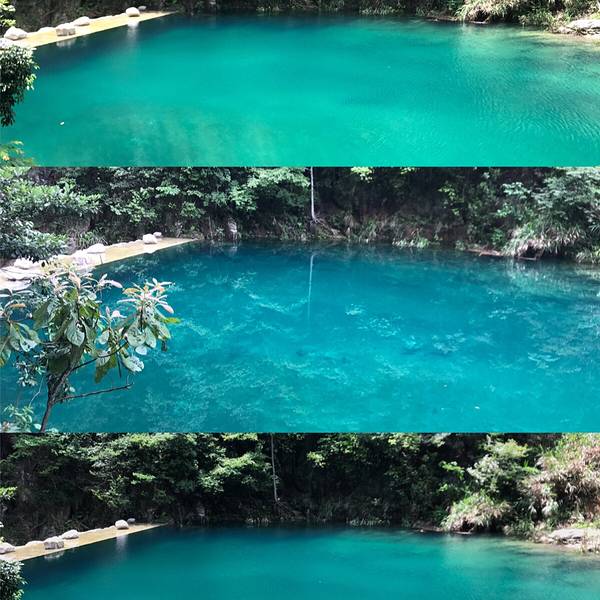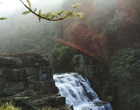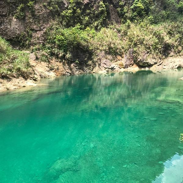 说实话,这个地方来了三次,前两次很不巧没进的去。所以,硬着头皮也要进去,趁我走之前一定要去看一眼玉帘。前两次,我已经把这个门给研究好了。所以就胆子大到一个人翻这个铁门进去,哈哈。进去后,遇到了一帮领导视察景区(因为还有2天就开放了),我就硬着头皮说:拜托一定要让我看到玉帘瀑布,我才能走。领导们一看见我就说:怎么进来的啊?我老实交代是翻过来的。领导们还挺和善的,只说注意安全,看完赶紧出来。同一个地方,不同的光线拍出来的水色,真心美。玉帘瀑布:距今约五亿年前(寒武纪)瘤状灰岩和泥灰岩形成的。宛如一挂白玉珠帘悬空垂下。遇到丰水期,会更美轮美奂。这是玻璃跳台,青山绿水环抱在怀,天光云影共徘徊。珠帘瀑布:倾斜型有潭瀑布。断层褶皱